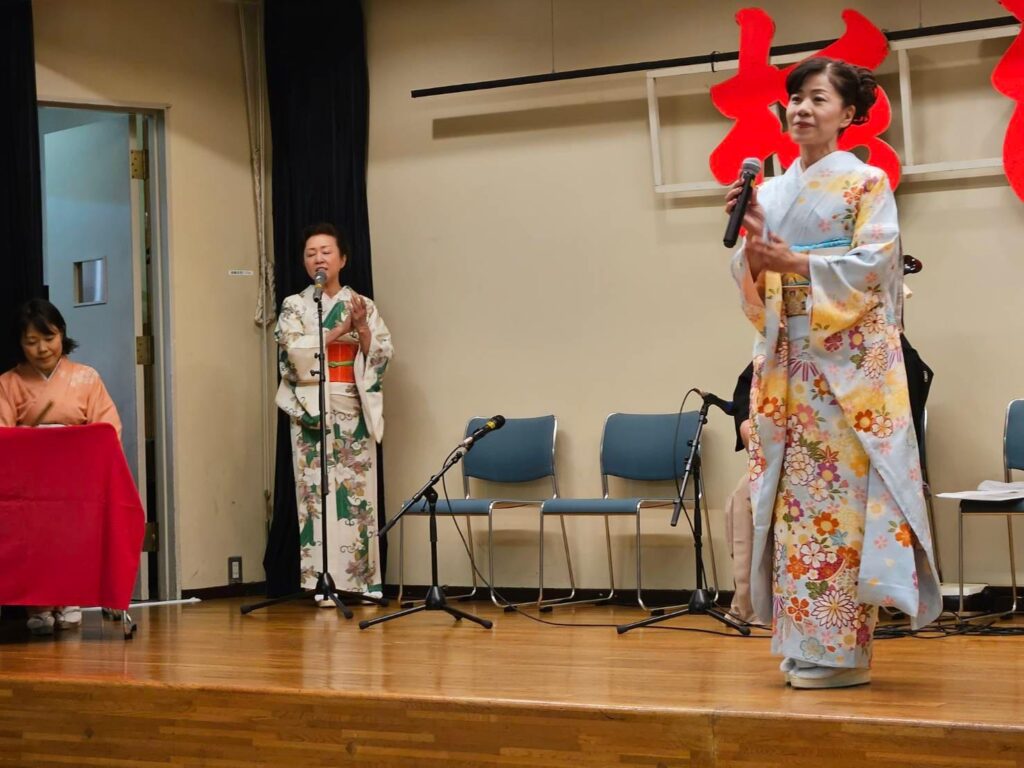 武花千草先生は「津軽ばやし」「南部牛追い唄」「本庄追分」をご披露し、武花烈子先生は「秋田飴売り唄」「秋田小原節」「北海ヤンレサ節」を熱唱され、杉淵会の舞台を大いに盛り上げます。